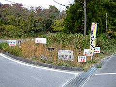 | 乗馬クラブの横を過ぎ、4差路へ。 ここで迷った。 てくてくおじさんのガイドマップ によると、まっすぐ中央分離帯の道を行くと、左に曲がる道があるというし、ここにある標識は良く分からないし。 左折するとセンターラインのある車道があったので、そちらを進む事にした |